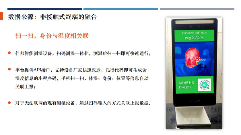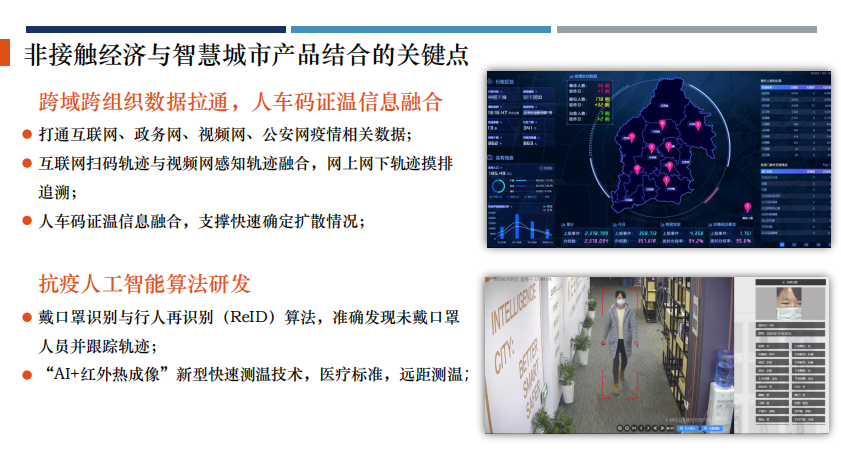 米兰milan科技智慧城市业务群产品经理袁名人分享了“非接触经济跟智慧城市新产品结合”的案例。“非接触型经济”已然崛起,其中的技术代表在对抗疫情过程中,发挥着重要的作用。数据采集,如测温、人脸等,加之与视频、地图等方面的融合,将在各个场景中达到非接触效果的最大化。而这些数字化、智能化的沉淀,正在以”非接触“的形式惠及更多的行业与社会公共事务。